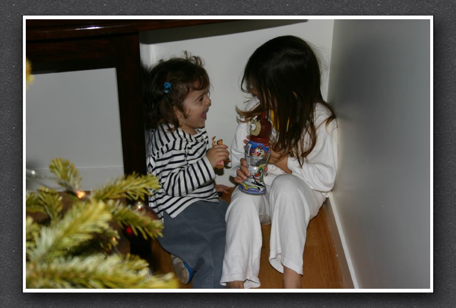Emma et Clara jouent à cache-cache. On aperçoit un bout du sapin de Noël. Sous la console et derrière le sapin, elles étaient bien planquées.